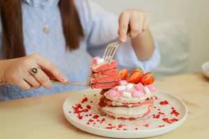 Cuatro tortitas americanas, de color rosa, con nubes, fresas y bañadas de crema kinder